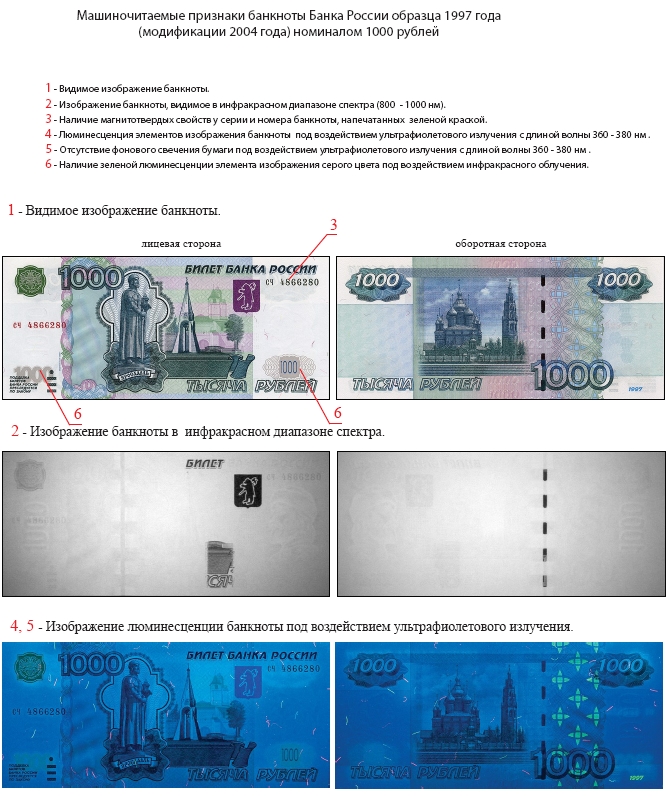 ОПИСАНИЕ признаков подлинности банкнот Банка России образца 1997 года (модификации 2004 г.) номиналом 1000 рублей.