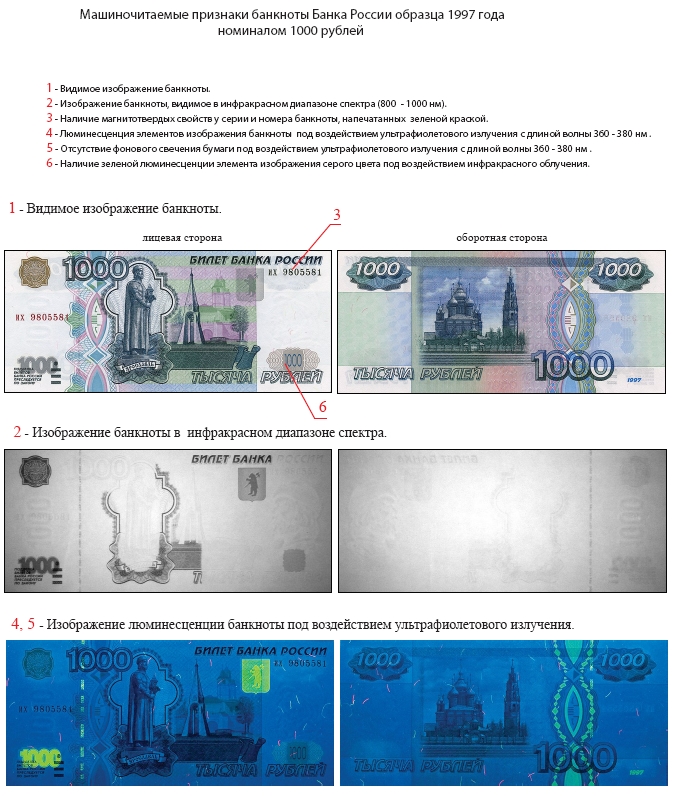 ОПИСАНИЕ признаков подлинности банкноты Банка России образца 1997 года номиналом 1000 рублей.