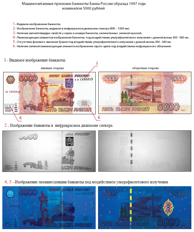ОПИСАНИЕ признаков подлинности банкноты Банка России образца 1997 года номиналом 5000 рублей.