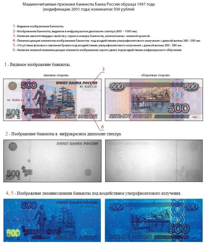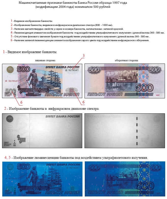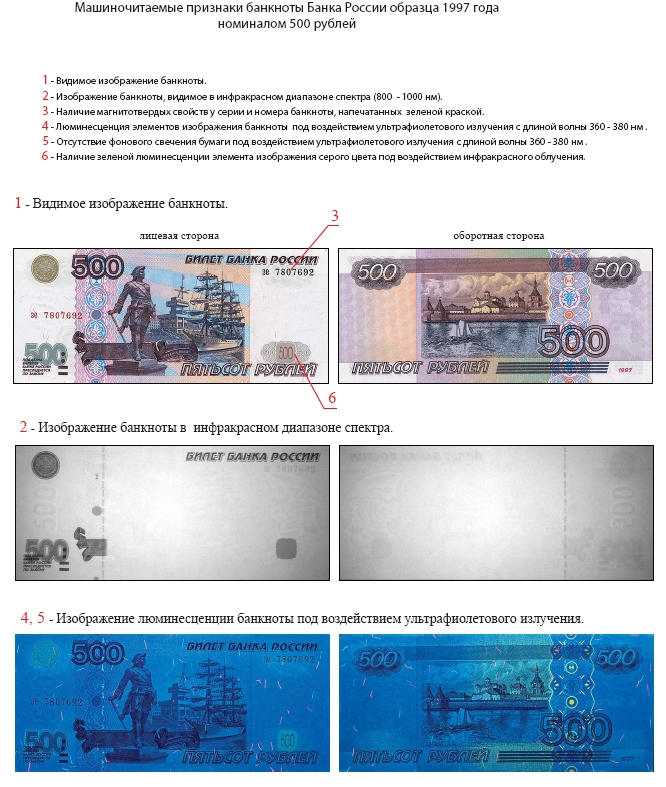 ОПИСАНИЕ признаков подлинности банкноты Банка России образца 1997 года номиналом 500 рублей.