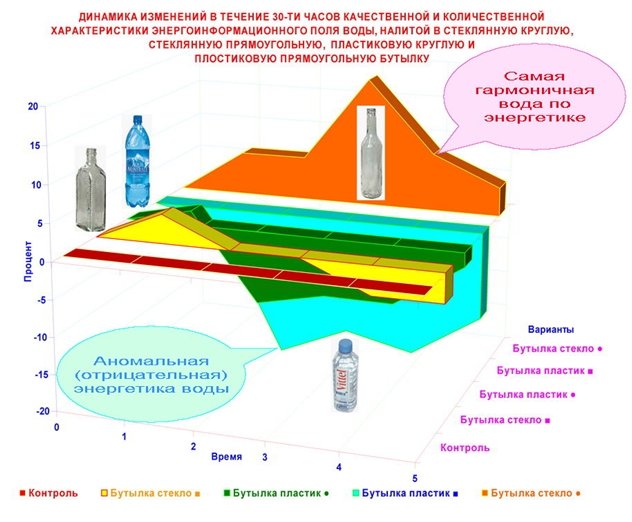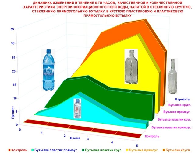 Через пять часов экспонирования структурированная вода меньше всего теряла энергетику в круглой стеклянной бутылке. И больше всего в прямоугольной пластиковой бутылке.