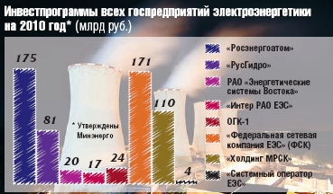 Инвестиционные программы госкомпаний будут финансироваться преимущественно за счет тарифных источников. Это в сумме даст 216,433 млрд рублей, из средств федерального бюджета добавят еще 108,017 млрд. Объем инвестиционной программы "Федеральной сетевой компании ЕЭС" (ФСК) на 2010 год составит 170,953 млрд рублей, "Холдинга МРСК" - 110,176 млрд рублей, "РусГидро" - 80,612 млрд рублей, РАО "Энергетические системы Востока" - 20,491 млрд рублей, "Интер РАО ЕЭС" - 16,635 млрд рублей, а находящейся у него в управлении ОГК-1 - 23,635 млрд рублей. Инвестиционная программа "Системного оператора ЕЭС" - 4,163 млрд рублей. Самая большая инвестиционная программа в 2010 году у концерна "Росэнергоатом" - 174,791 млрд рублей.