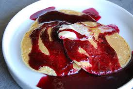 Готовят блинчики обычным способом: яйца, соль, сахар взбивают венчиком 1-2 минуты, но вместо молока добавить разбавленный водой (1:5) сок черноплодной рябины, перемешать и всыпать просеянную муку.